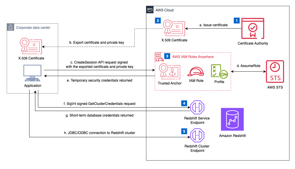 - IAM Roles Wherever – Points short-term AWS credentials to on-premises processes primarily based on X.509 certificates from a corporation’s certificates authority. These non permanent credentials enable the workload to imagine an IAM function that grants entry to Amazon Redshift APIs.